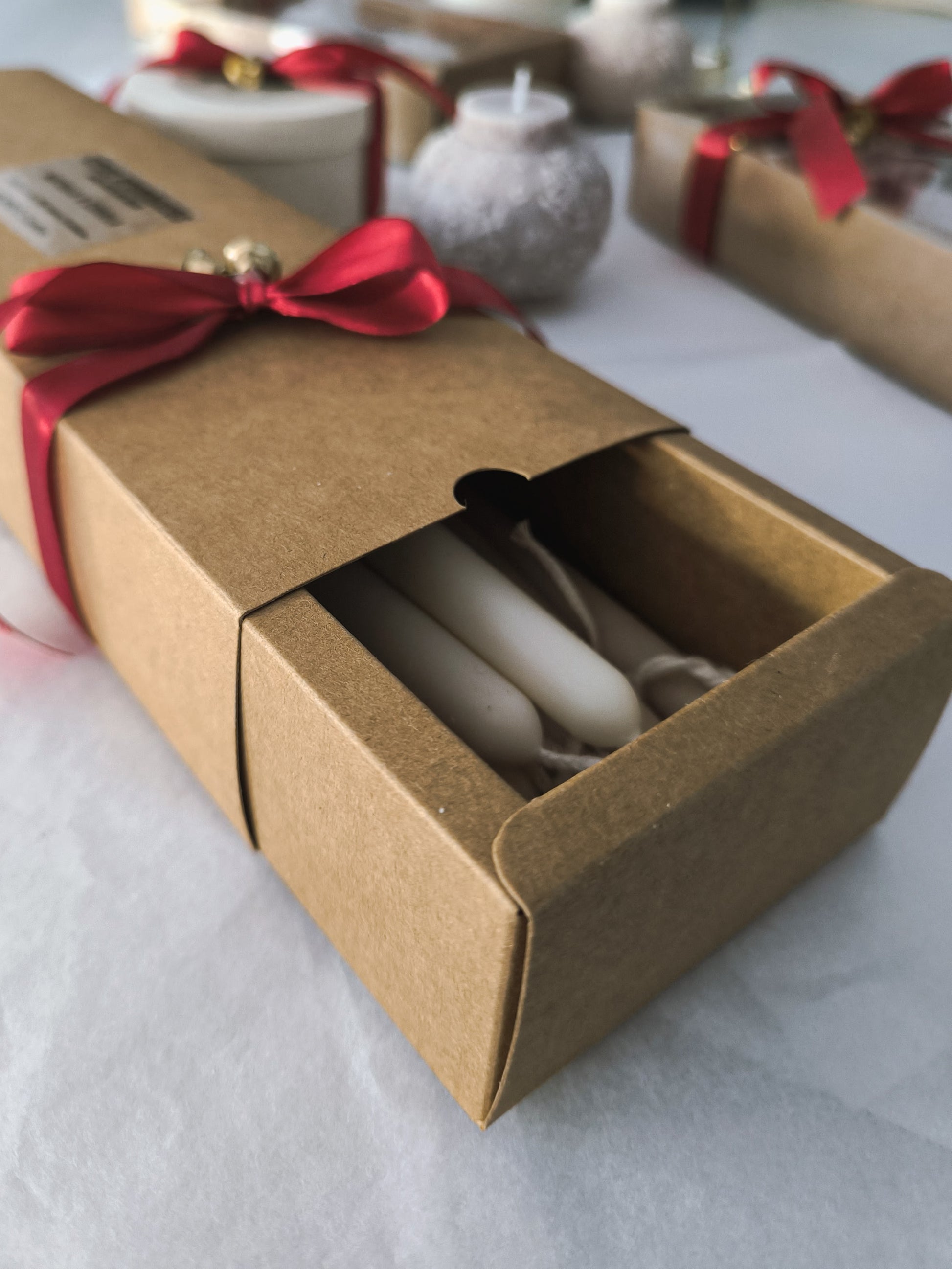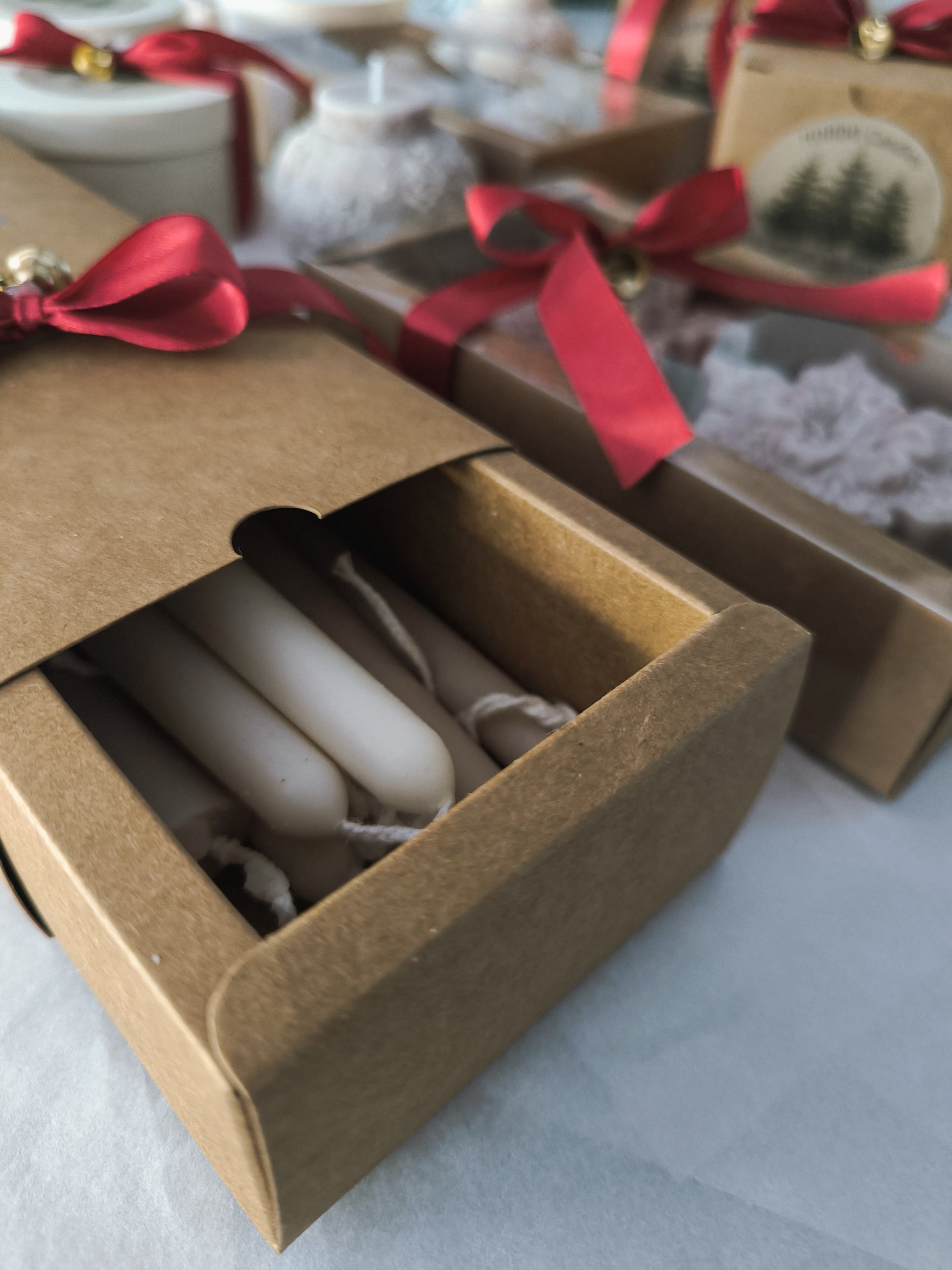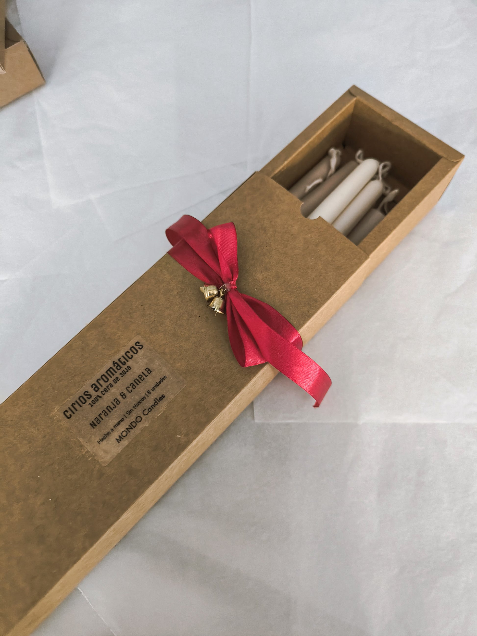 Presentación: cajas de 8 cirios en suaves y diferentes tonos tostados.