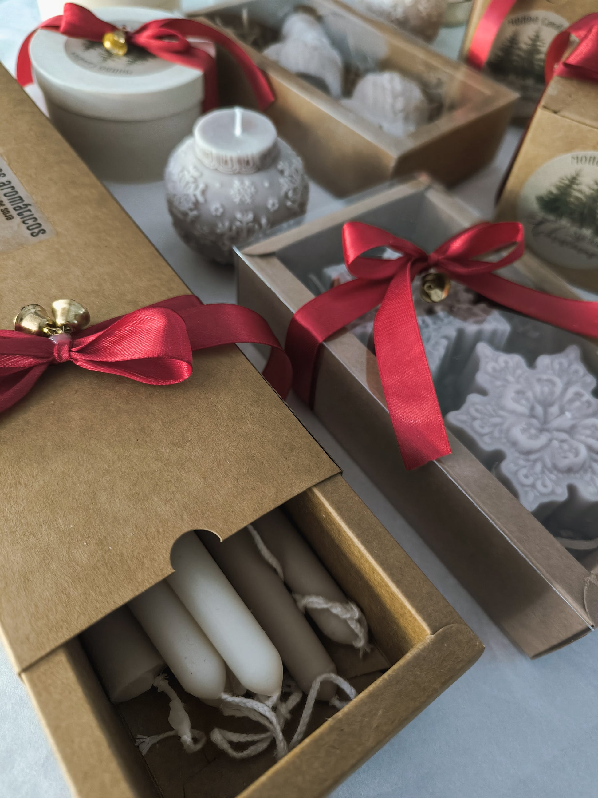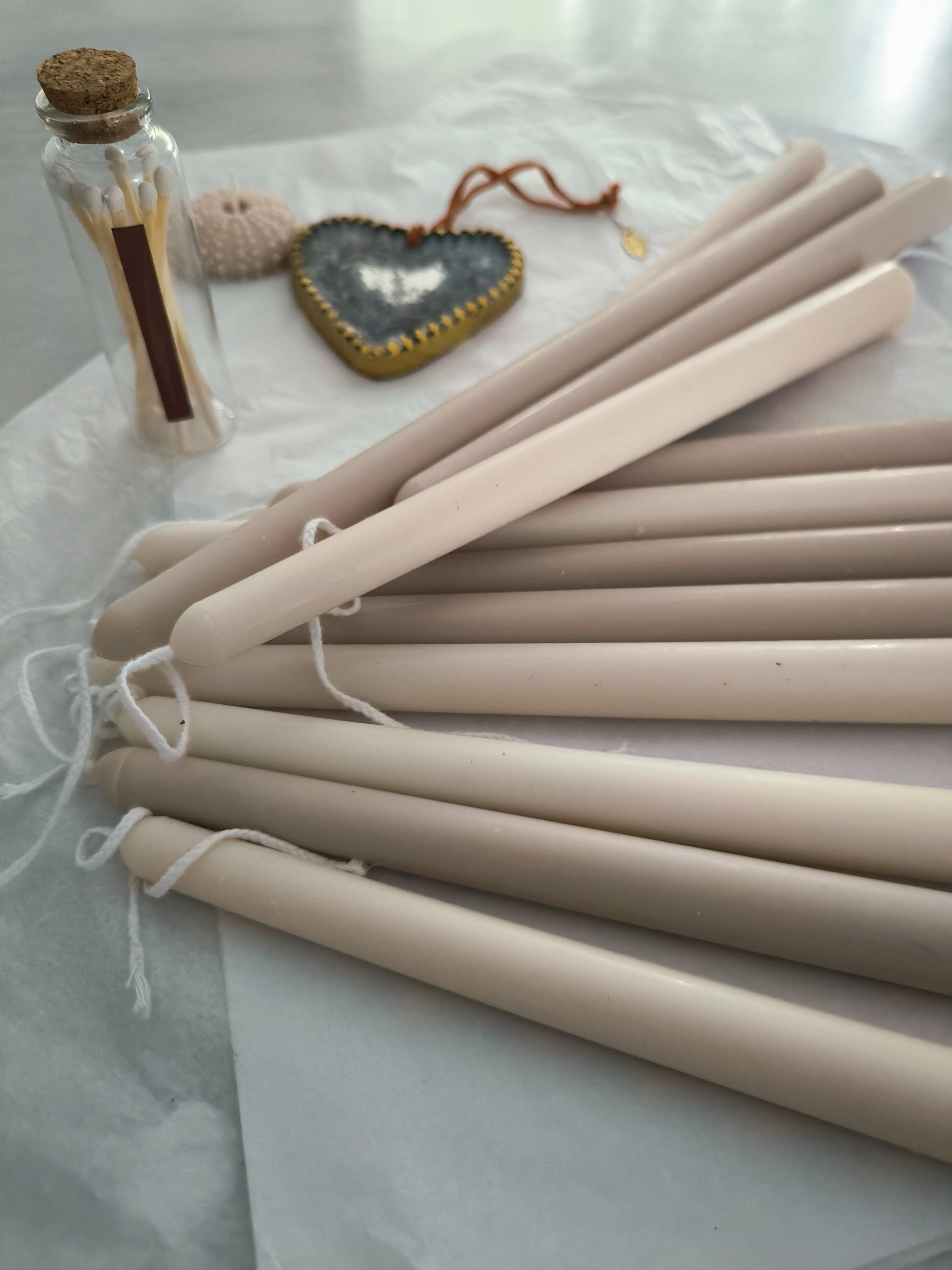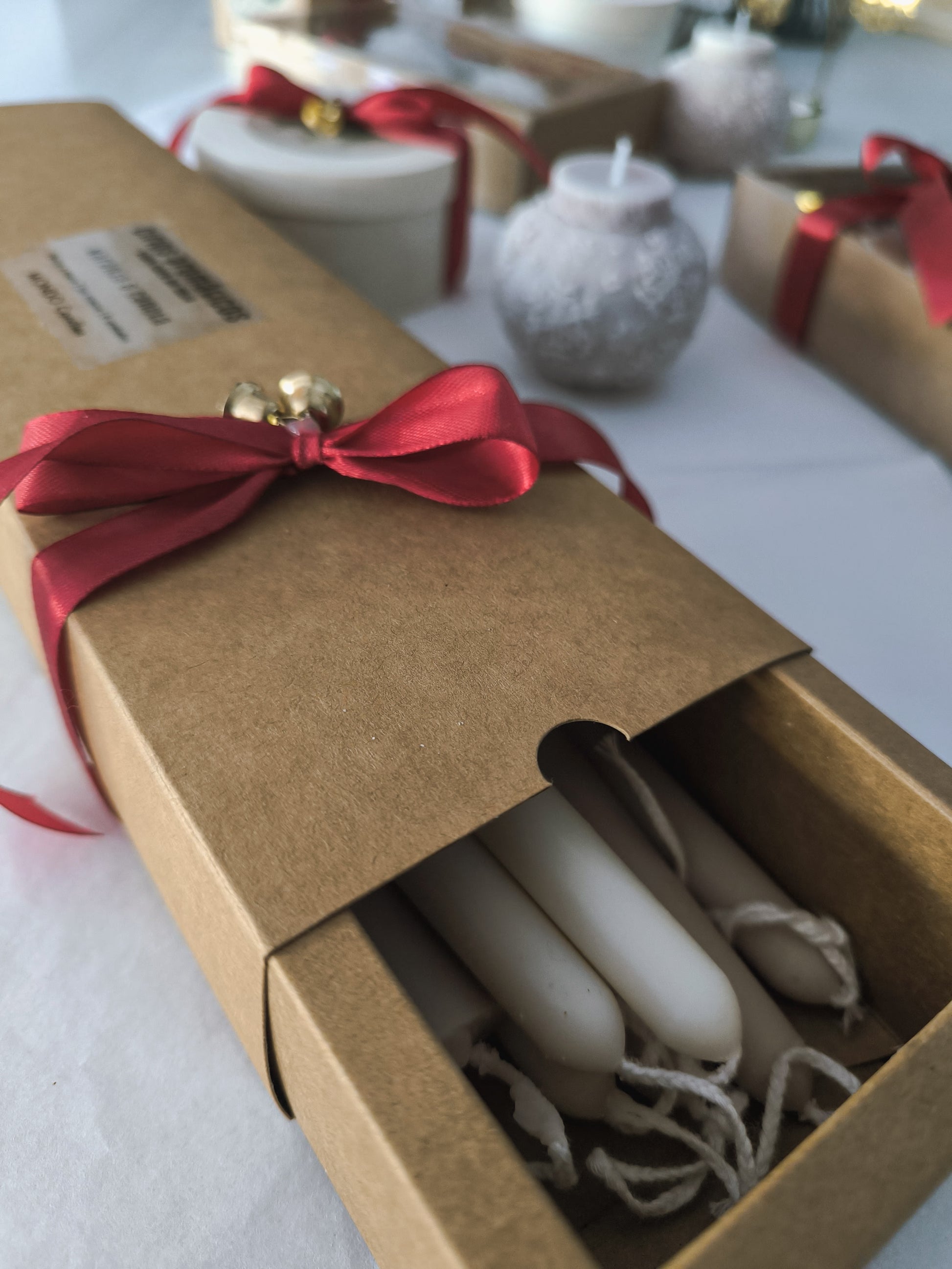 Presentación: cajas de 8 cirios en suaves y diferentes tonos tostados.