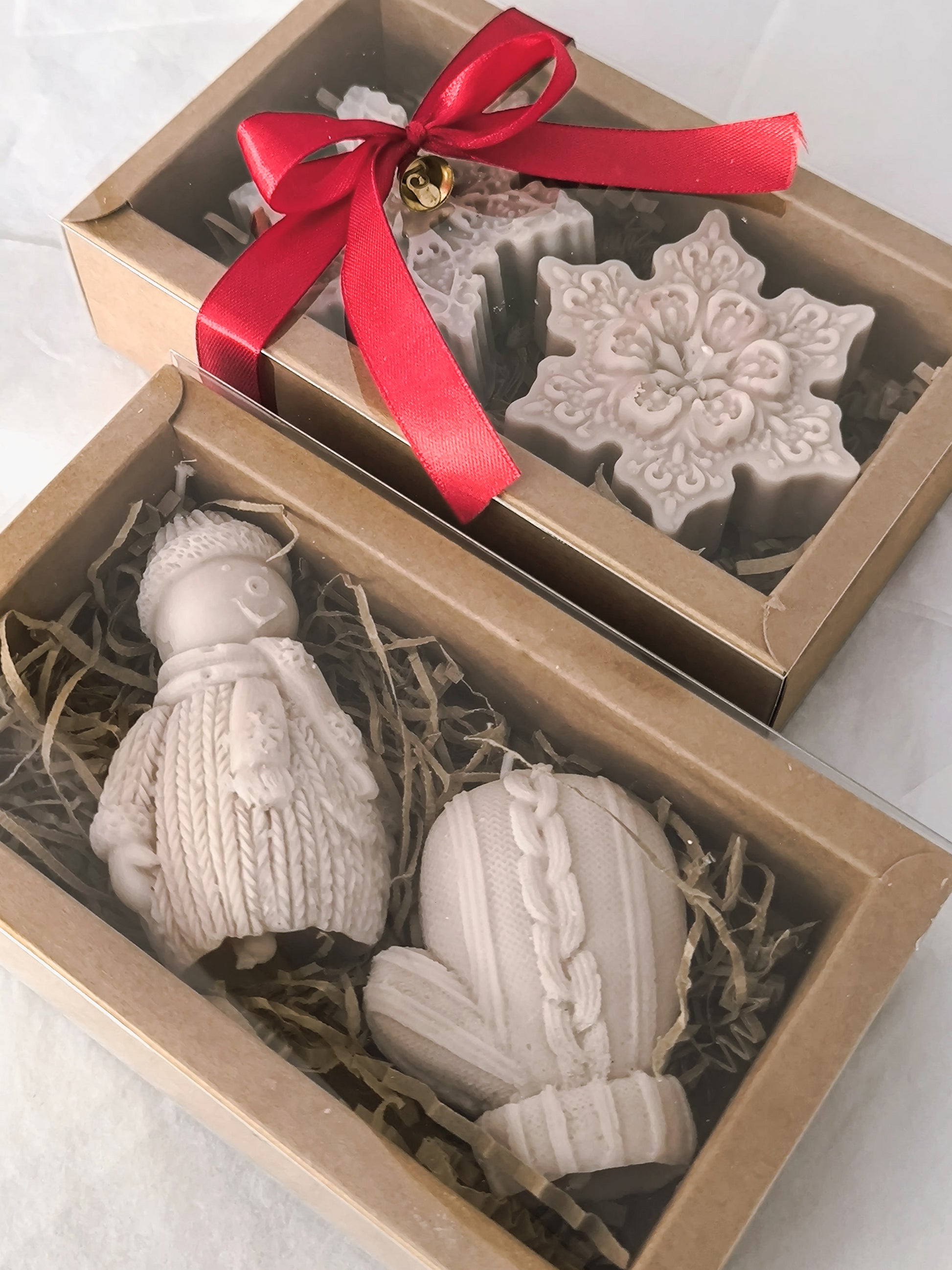 Dos pequeñas figuras que condensan la magia del invierno: un muñeco de nieve y unos guantes de lana, elaborados artesanalmente con cera de soja natural y la fragancia cálida de pino, madera y canela.