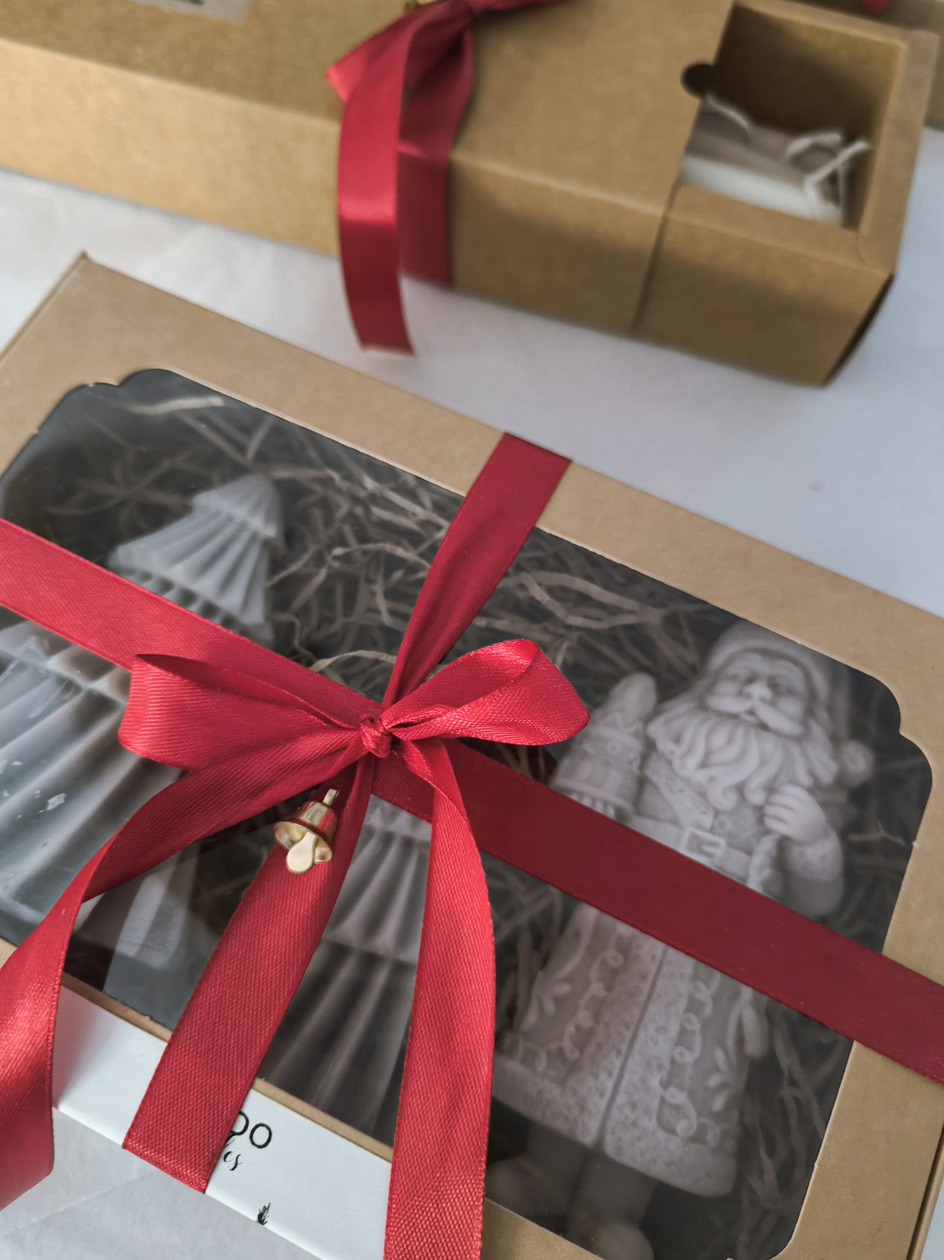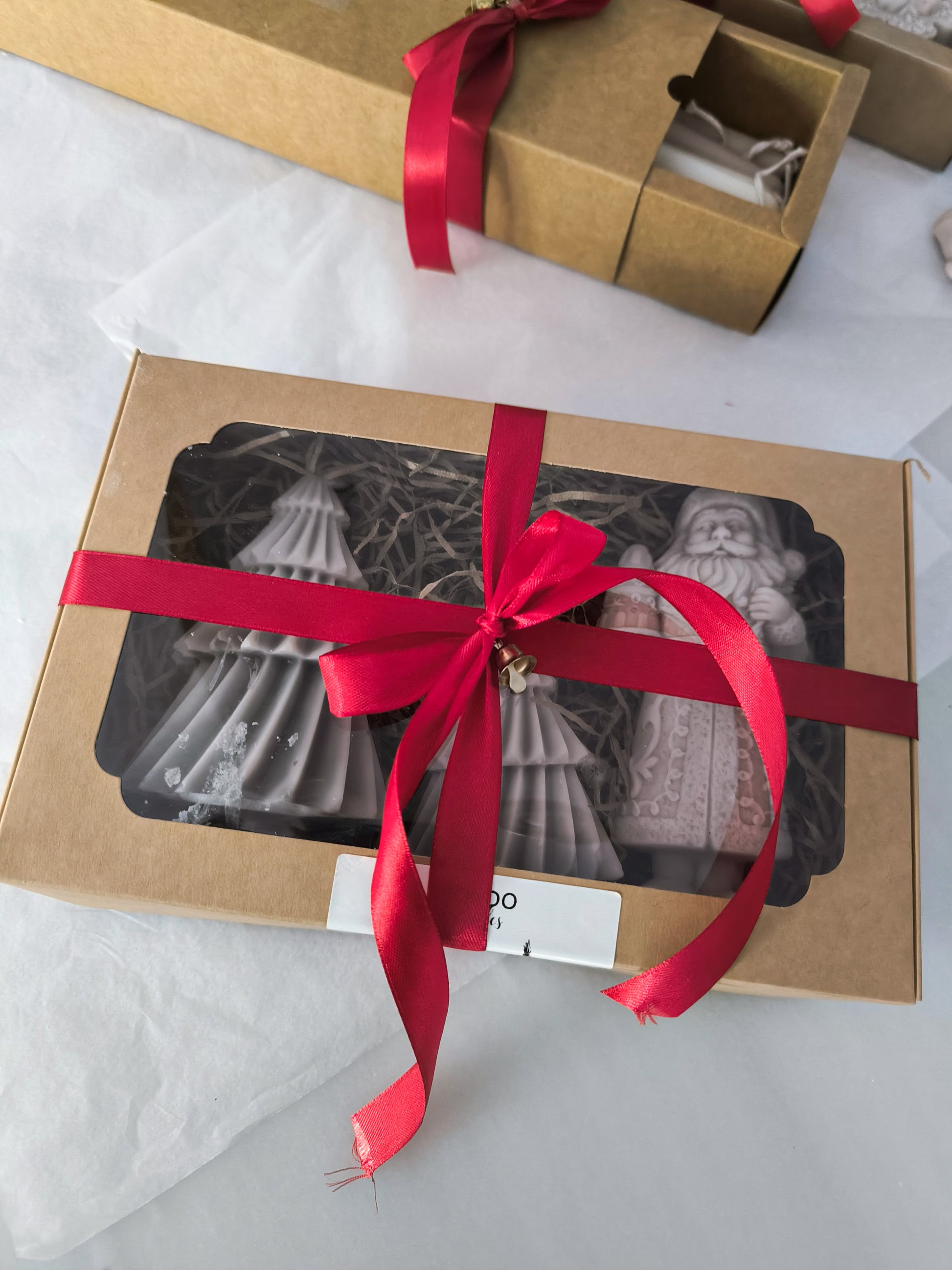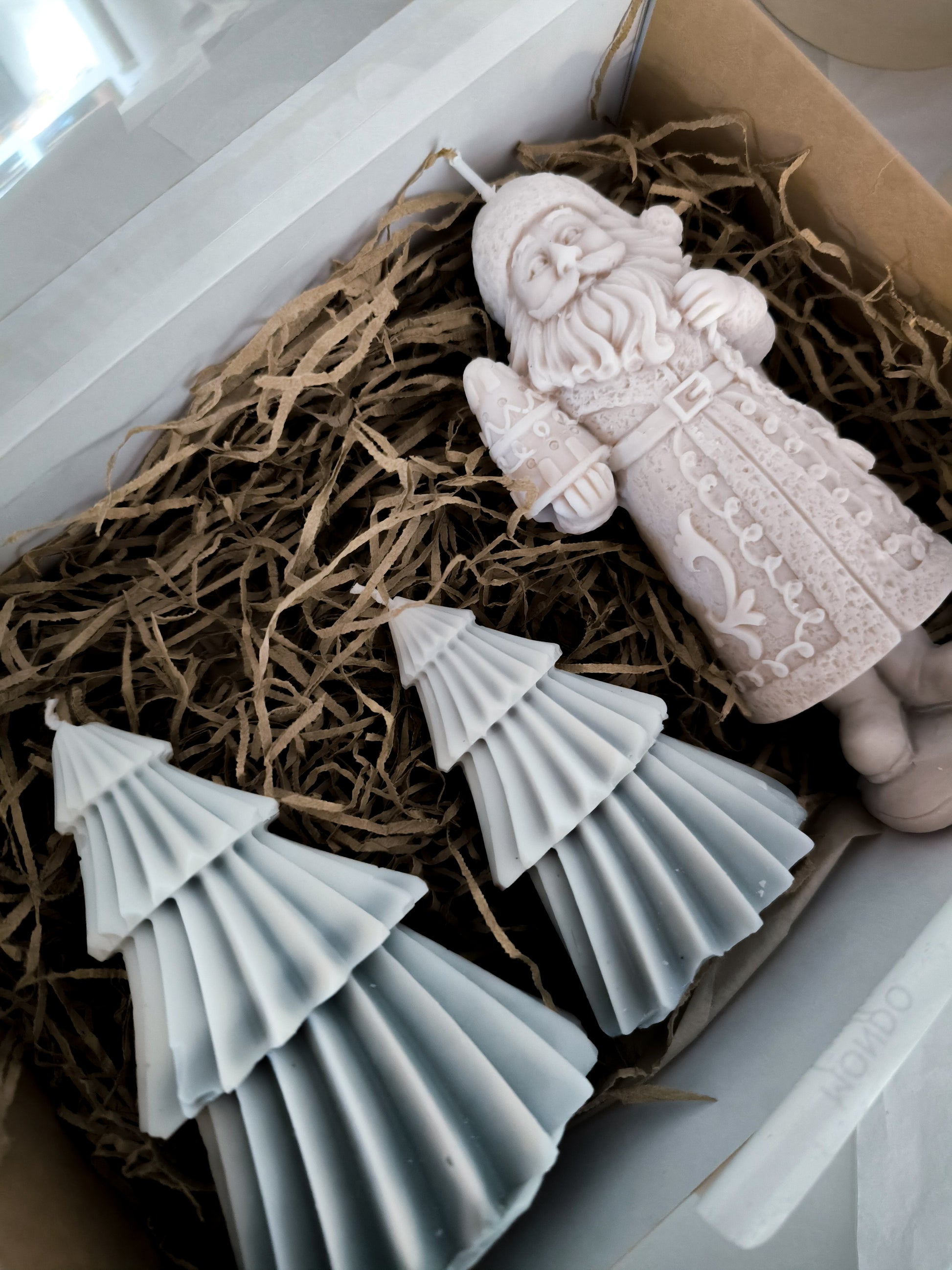 Tres figuras que capturan la magia de la Navidad: abetos de diferentes medidas, y un detallado San Nicolás, elaborados artesanalmente con cera de soja natural y la fragancia cálida de pino, madera y canela.