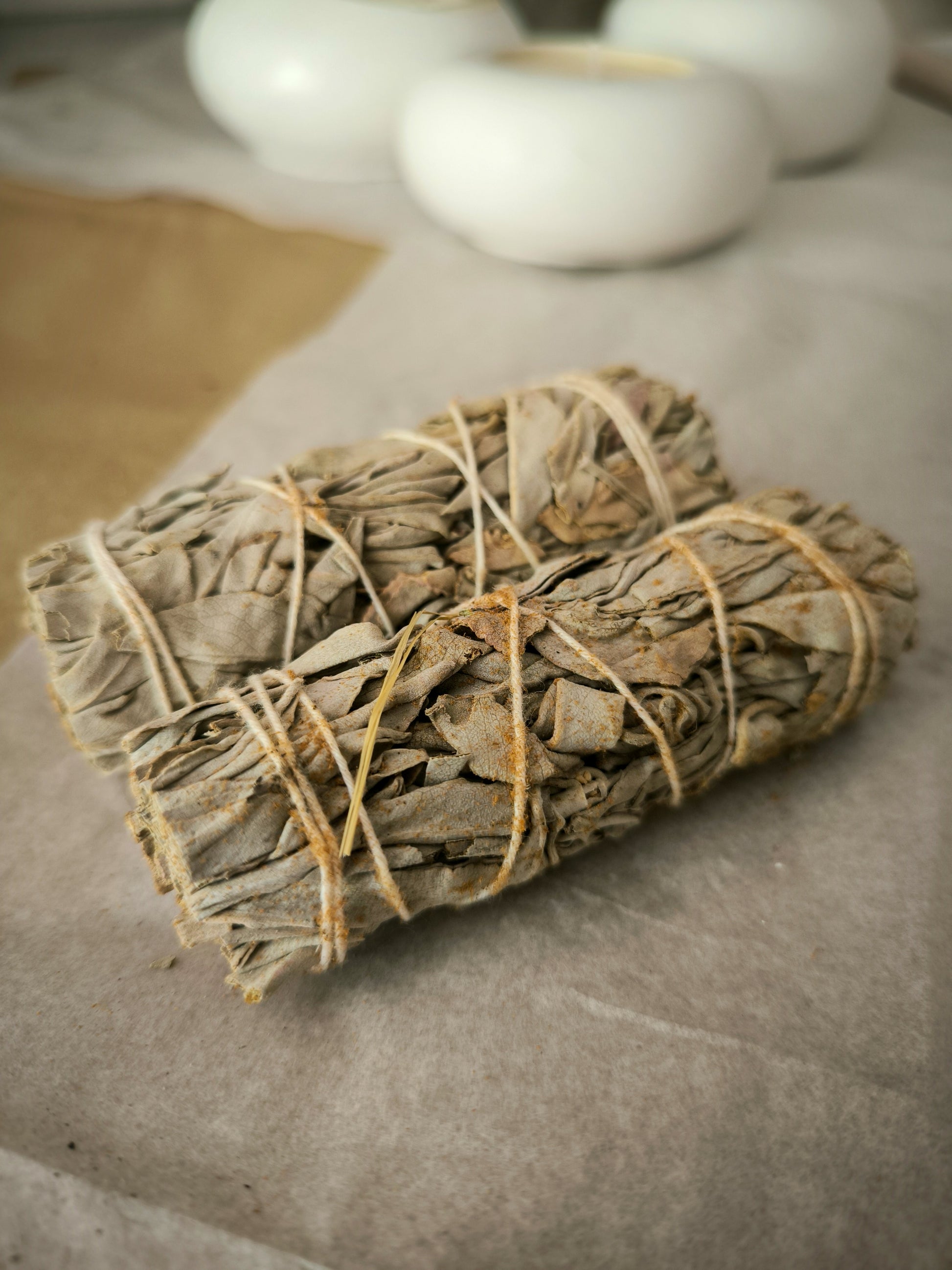 Además, en nuestra tienda encontrarás quemadores artesanos de cemento blanco, diseñados especialmente para salvia, Palo Santo e incienso, que completan el ritual y aportan un toque decorativo único.