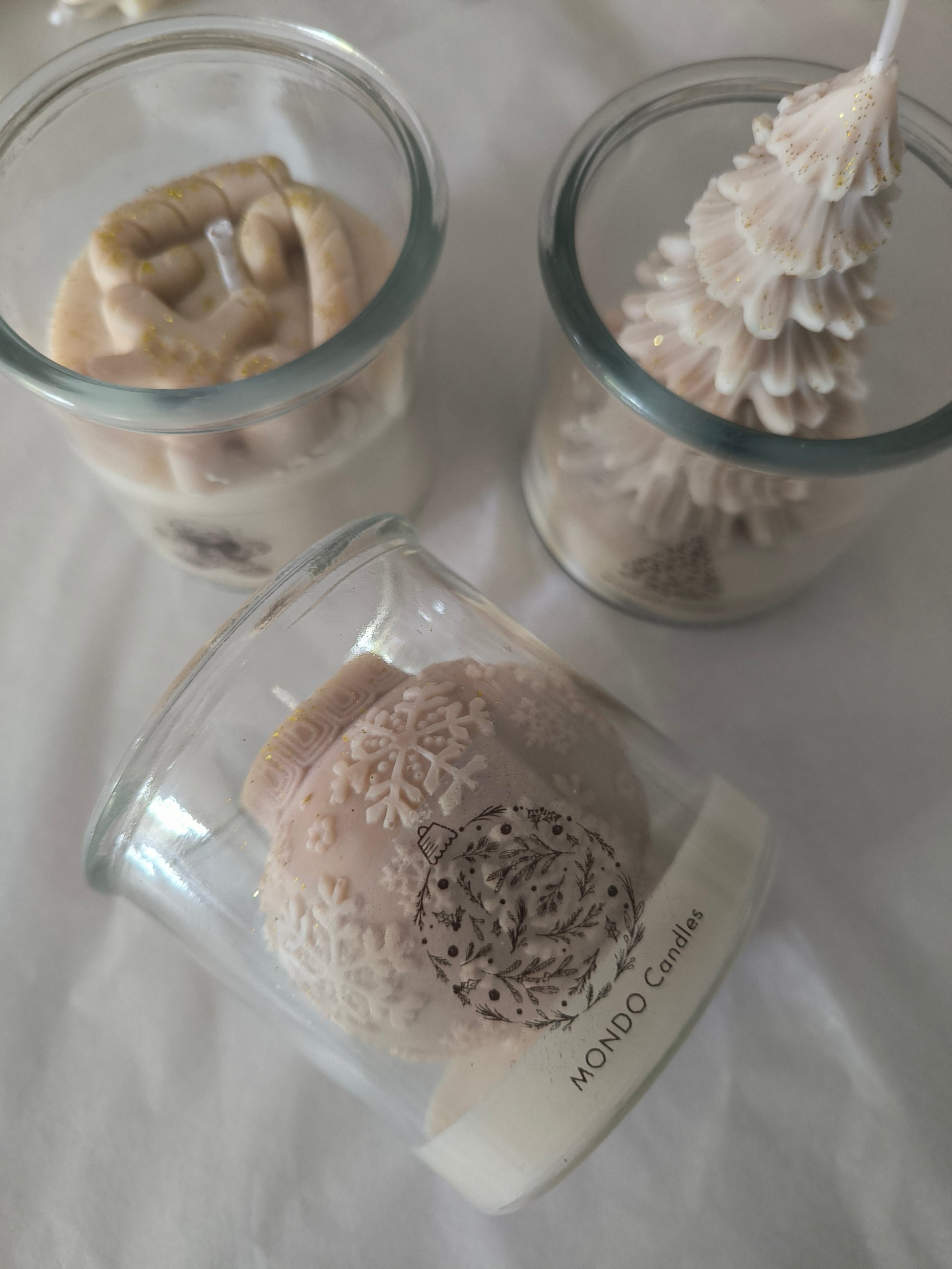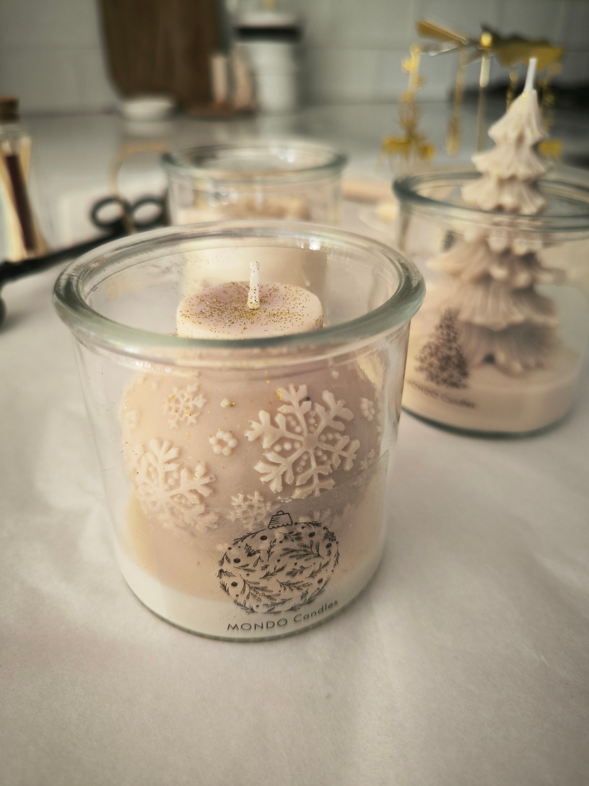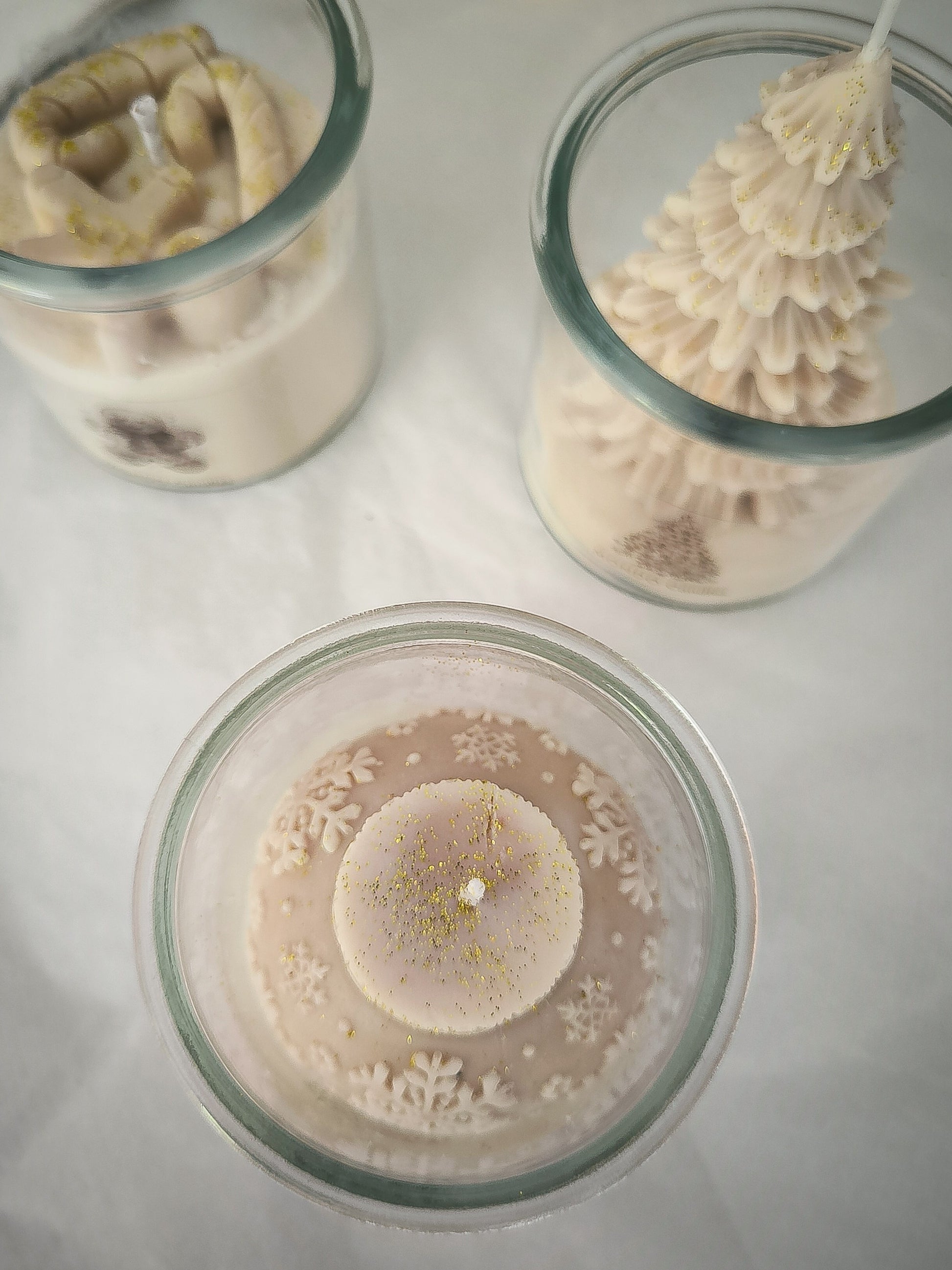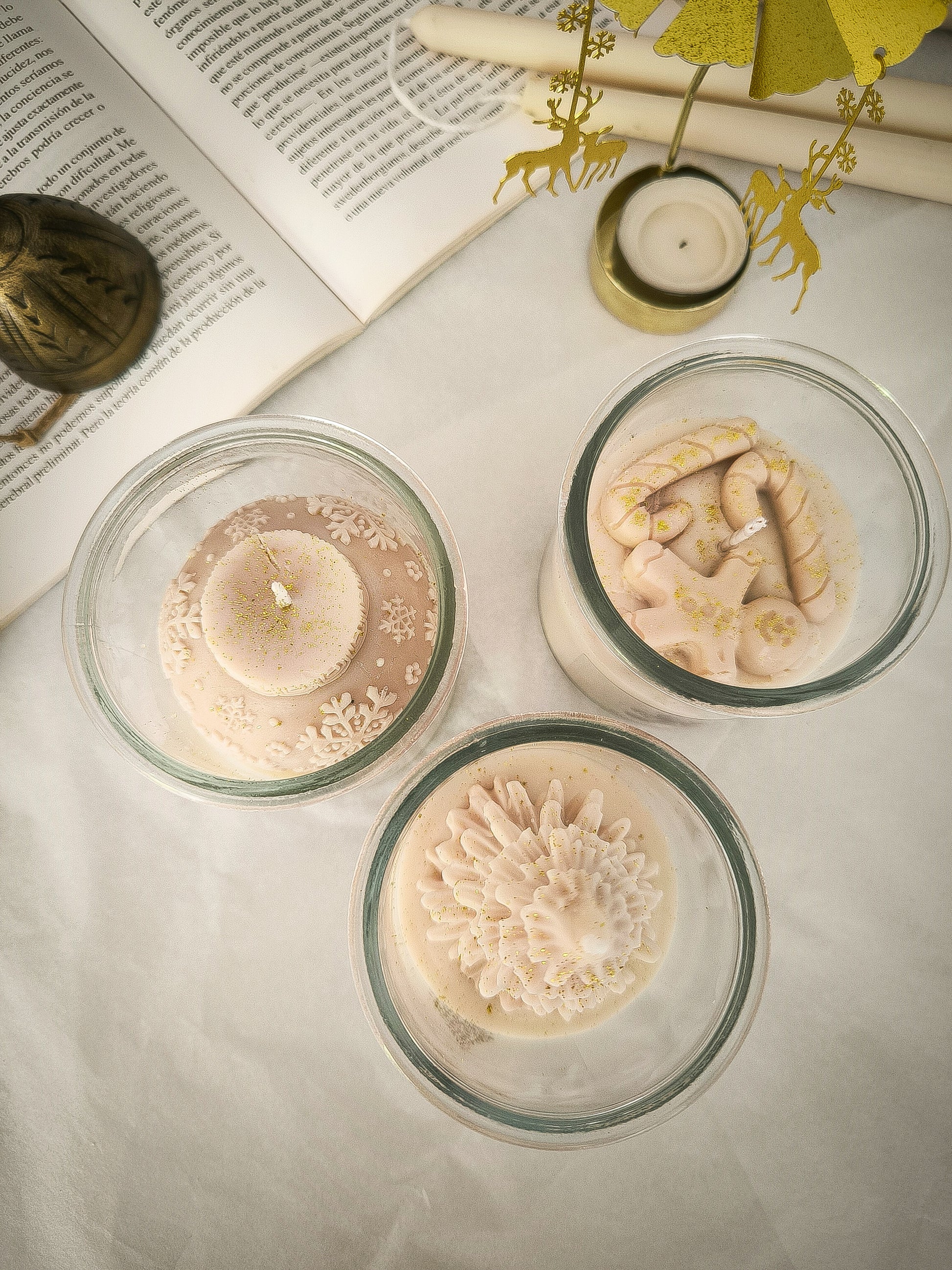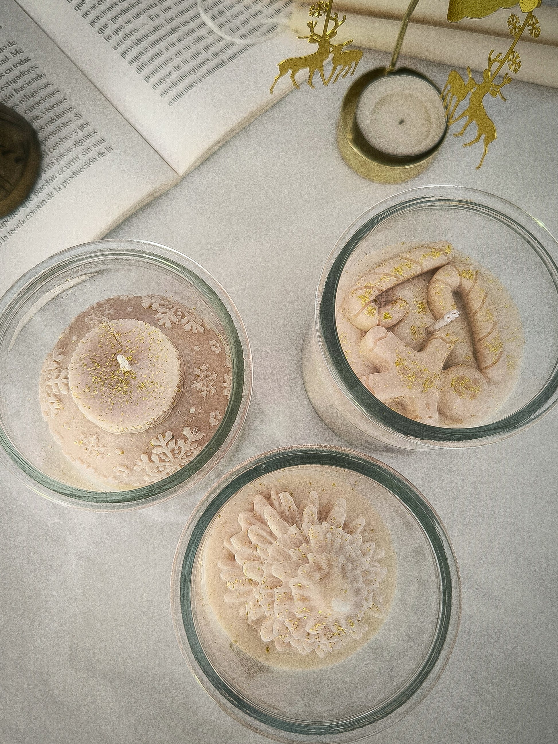 Tres velas artesanales de cera de soja, elaboradas una a una en recipiente de vidrio, con formas y aromas inspirados en los momentos más acogedores del invierno.