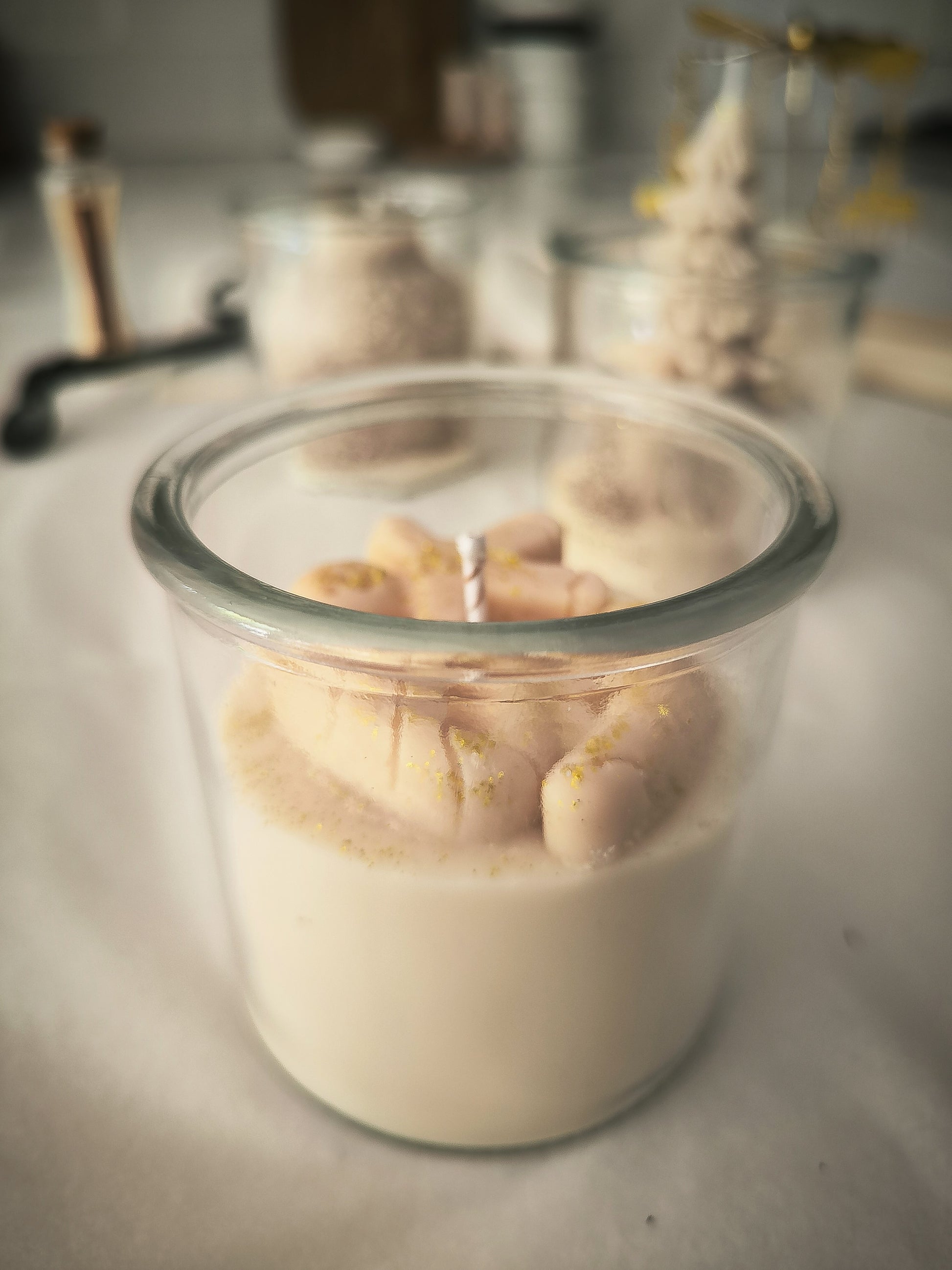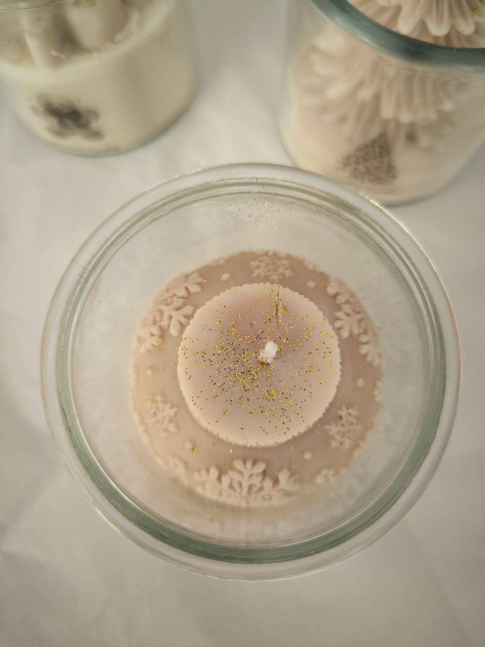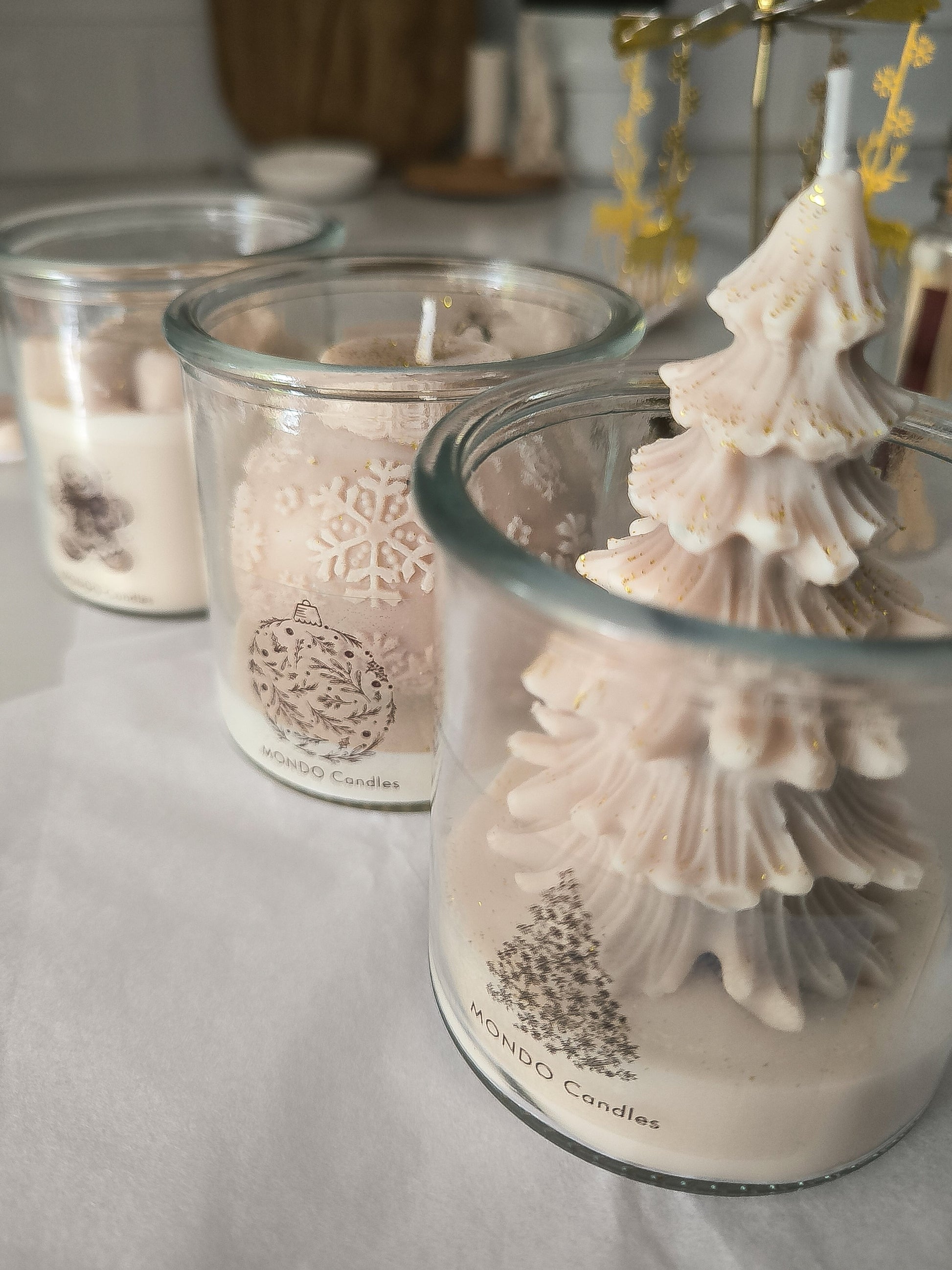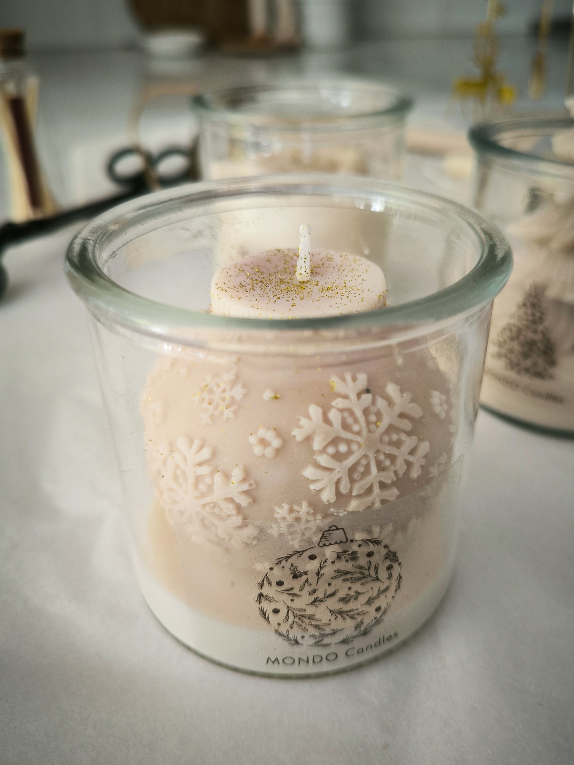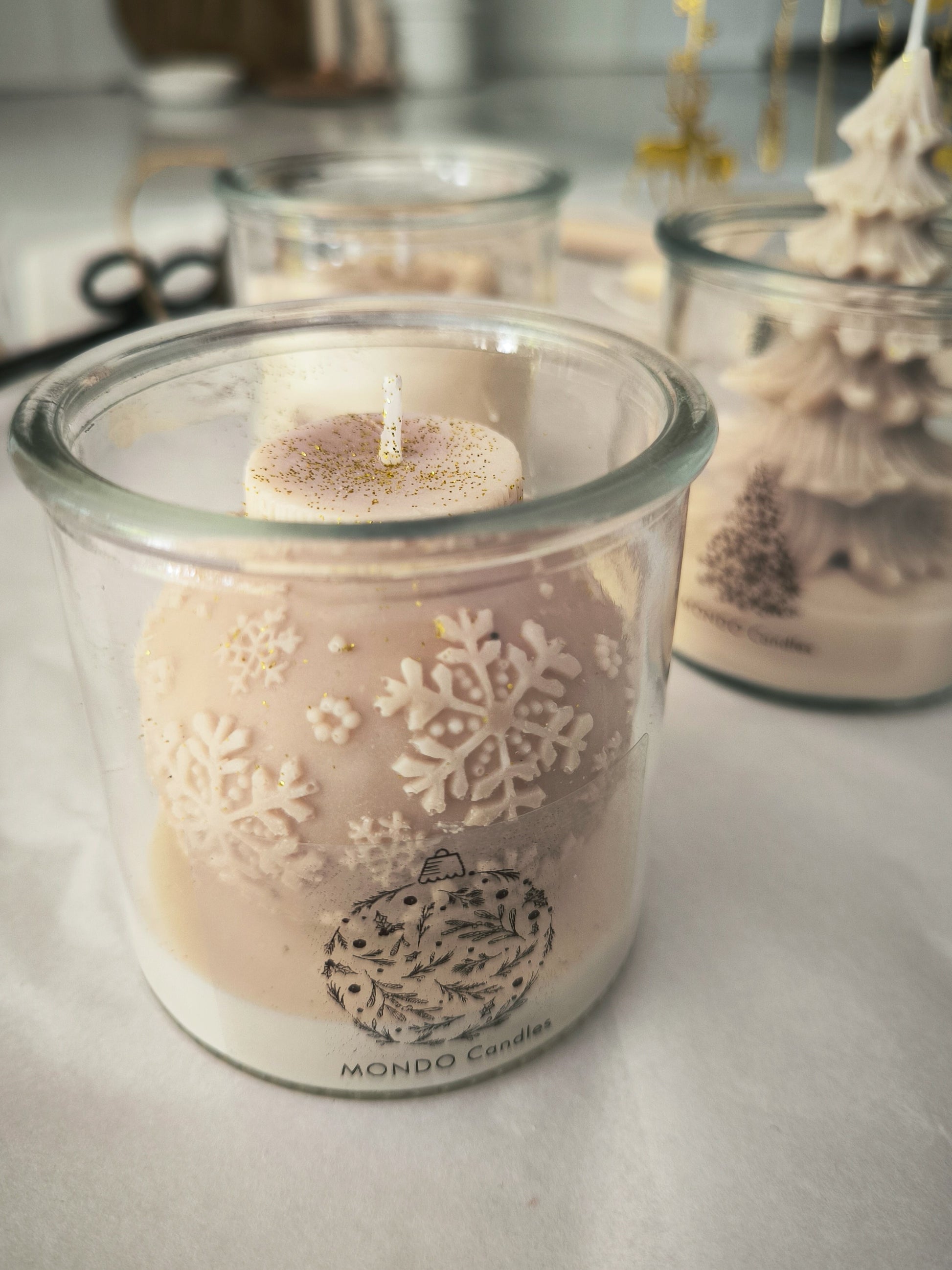 Tres velas artesanales de cera de soja, elaboradas una a una en recipiente de vidrio, con formas y aromas inspirados en los momentos más acogedores del invierno.